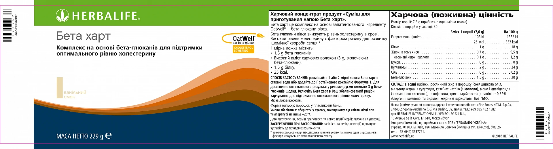 Багатий поживними речовинами концентрат клітковини вівса з ванільним смаком, який містить бета-глюкани вівса завдяки зареєстрованій добавці OatWell