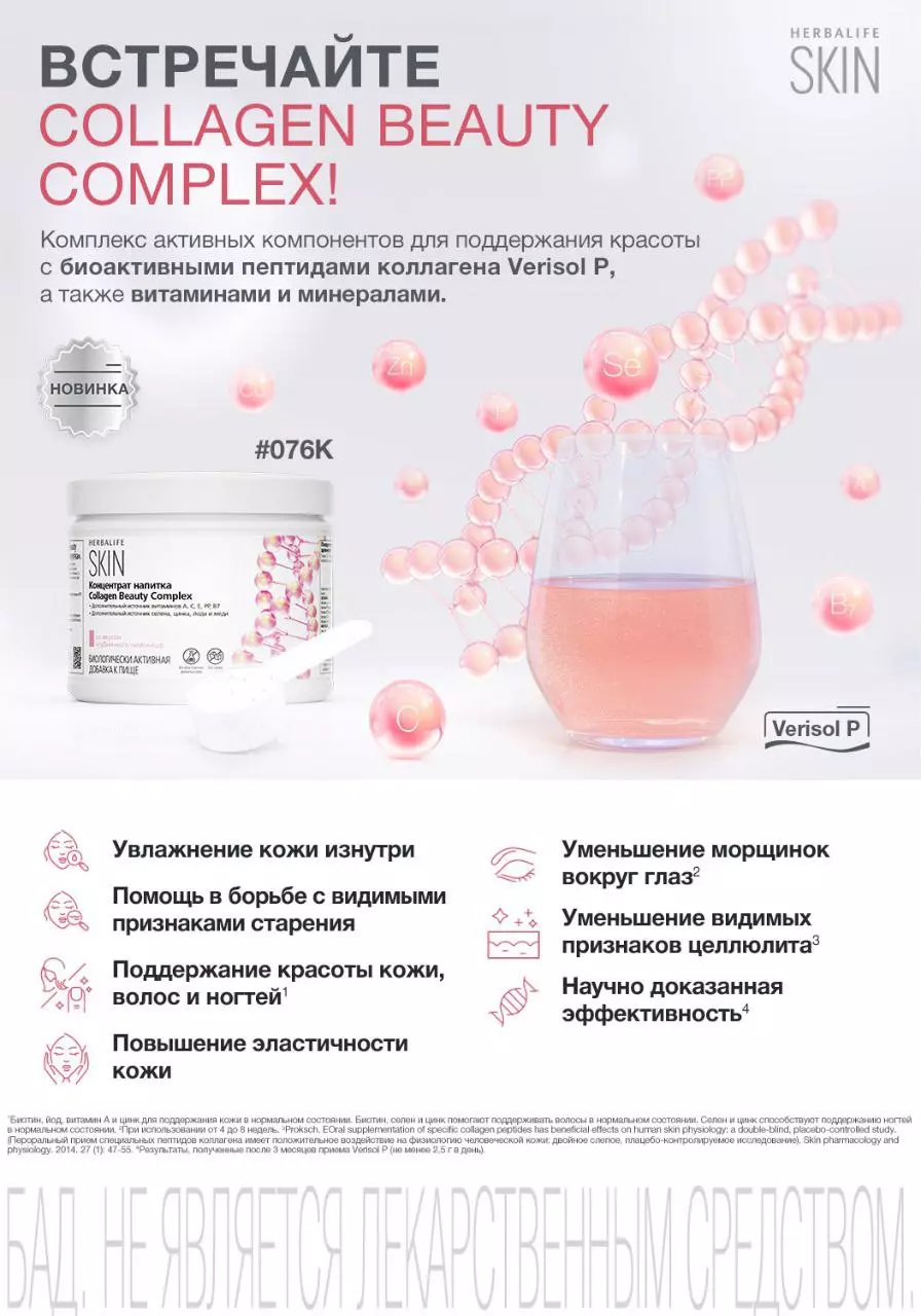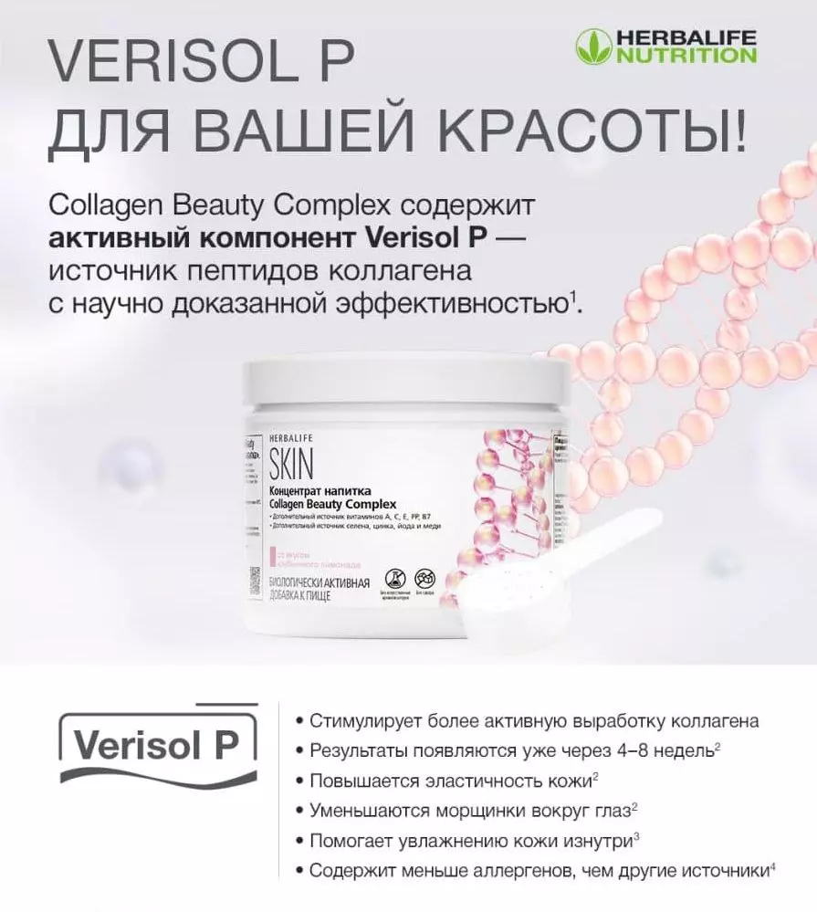 Комплекс активних компонентів для підтримки краси, що містить біоактивні пептиди колагену Verisol P, а також вітаміни та мінерали, які зволожують шкіру зсередини та борються з видимими ознаками старіння1. Ефективність продукту науково доведена!