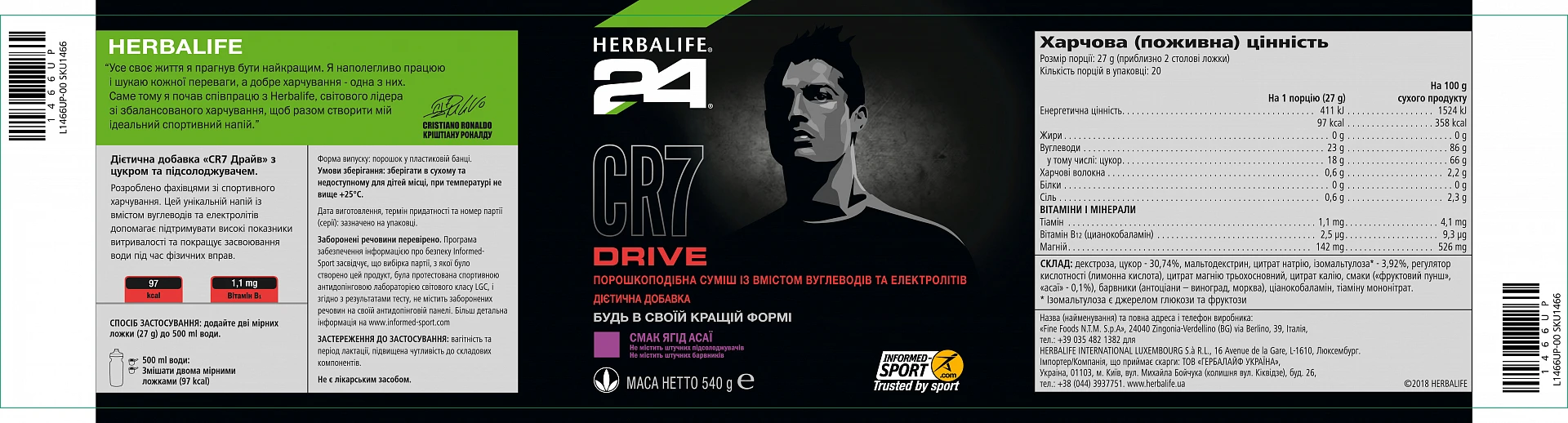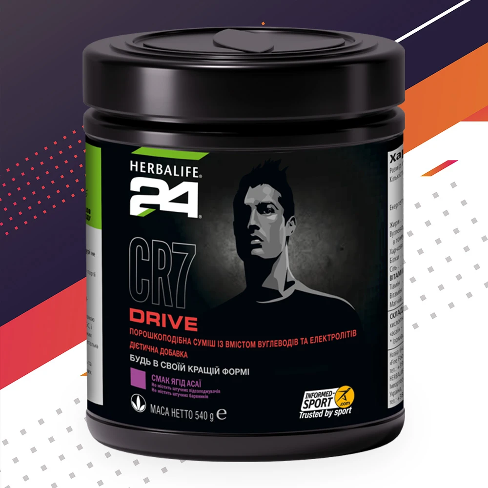 Для приготування напою додати 1 мірну ложку CR7 Драйв (приблизно 13.5 г.) до 250 мл води, добре перемішати.